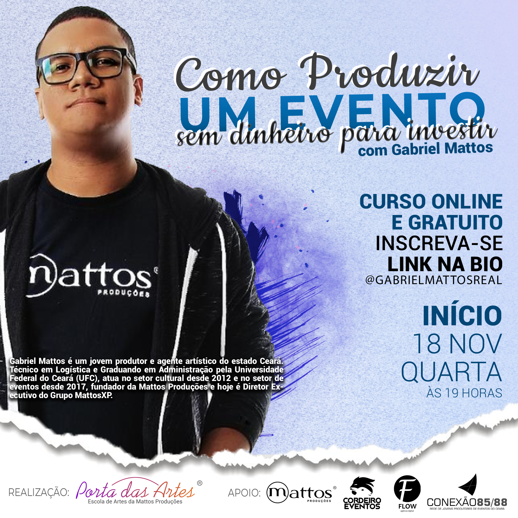 Resumo:Gabriel Mattos é eleito Conselheiro Estadual de Políticas Culturais do Ceará, pela 2ª vez, e ex-Conselheiro Municipal de Políticas Culturais de Fortaleza. Com mais de 13 anos de experiência no setor cultural, é empresário e, como Diretor da Mattos Produções e Diretor-Presidente do Instituto Pode Mais, atua em diversas cidades do estado, destacando-se por promover a inclusão e diversidade por meio da arte e cultura das favelas. Técnico em Logística e graduando em Administração, também possui expertise em políticas públicas e orçamento público, além de acreditação técnica para consultoria em fomento cultural. Vencedor de prêmios como Aqui Tem Juventude da Secretaria de Juventude de Fortaleza (2022), finalista do Prêmio Jovens Visionários da Prudential do Brasil no Rio de Janeiro (2023), é uma das lideranças negras nacionais financiadas pela Plataforma Alas da Fundação Tide Setúbal, de São Paulo.