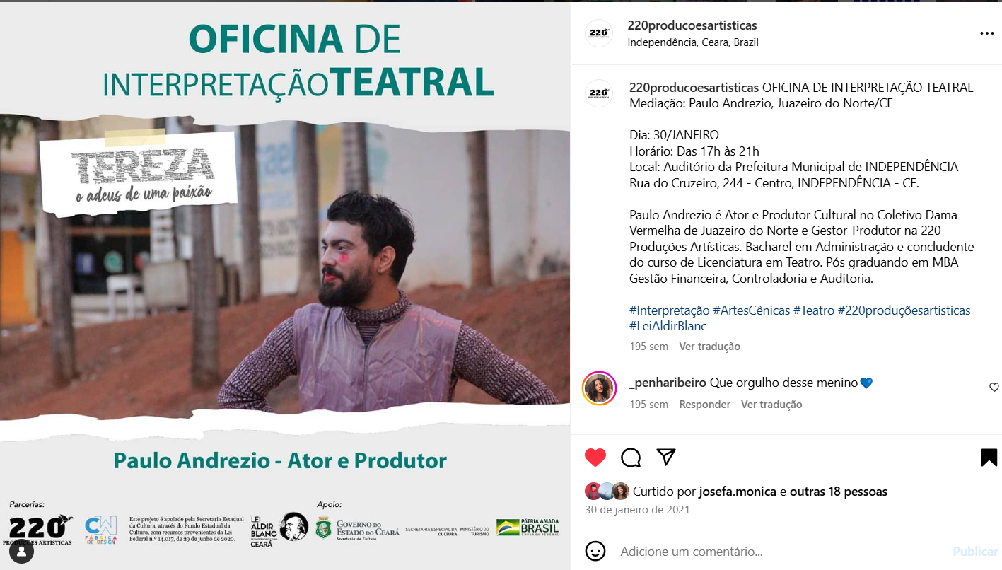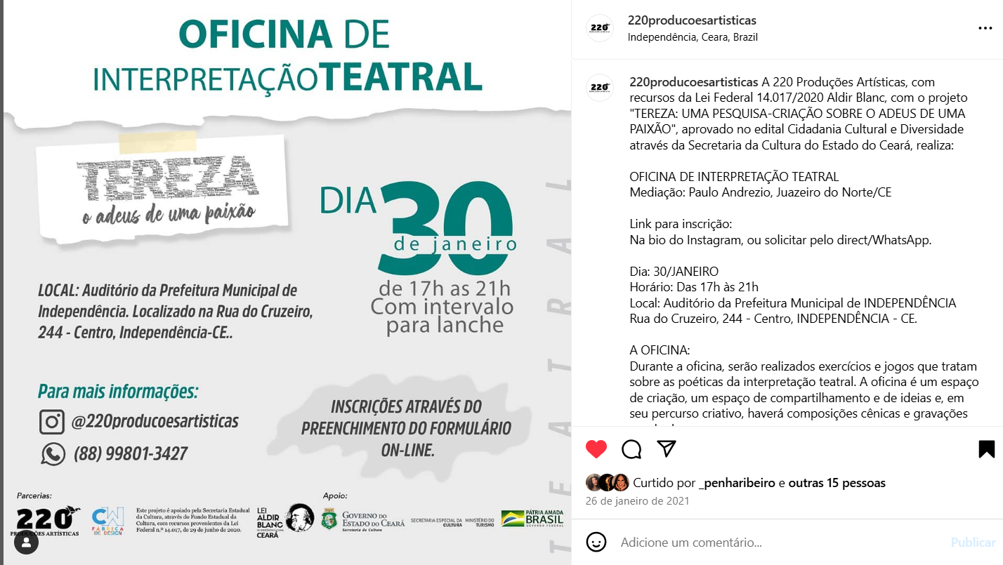 220 Produções Artísticas e Culturais atua desde 2018 na elaboração, gestão e execução de projetos culturais independentes e para editais públicos. Desenvolve produção e assessoria para artistas, grupos e coletivos, acompanhando criação, inscrição, execução e prestação de contas. Atua em teatro, cursos, educação, audiovisual, dança, cultura popular, eventos e políticas públicas no Ceará.