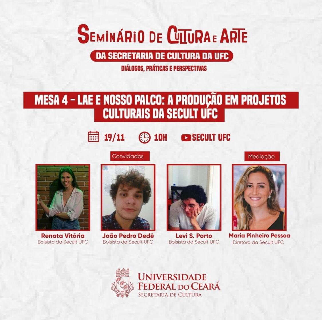 Em 2021, a equipe da Secult UFC produz as primeiras edições do Laboratório de Arte e Expressão (LAE), do Nosso Palco, do Seminário de Arte e Cultura e passa a atuar como conselheira titular do Conselho Editorial da UFC e do Conselho Municipal de Política Cultural (CMPC).